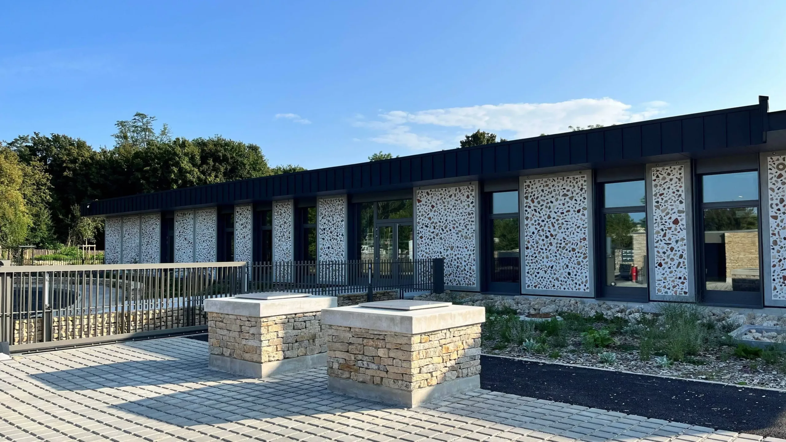 Le programme du concours mentionnant des vestiges déclassés mis à disposition du projet, nunc a proposé que la seule façade visible depuis l’espace public soit composée de panneaux intégrant ces biens archéologiques.