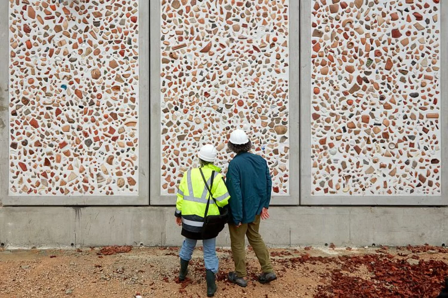 Après coulage et lissage du béton blanc, la mosaïque de vestiges peut commencer, et ne doit pas durer plus d’une trentaine de minutes, avant que le béton ne prenne. Opération à renouveler pour les 13 panneaux suivants !