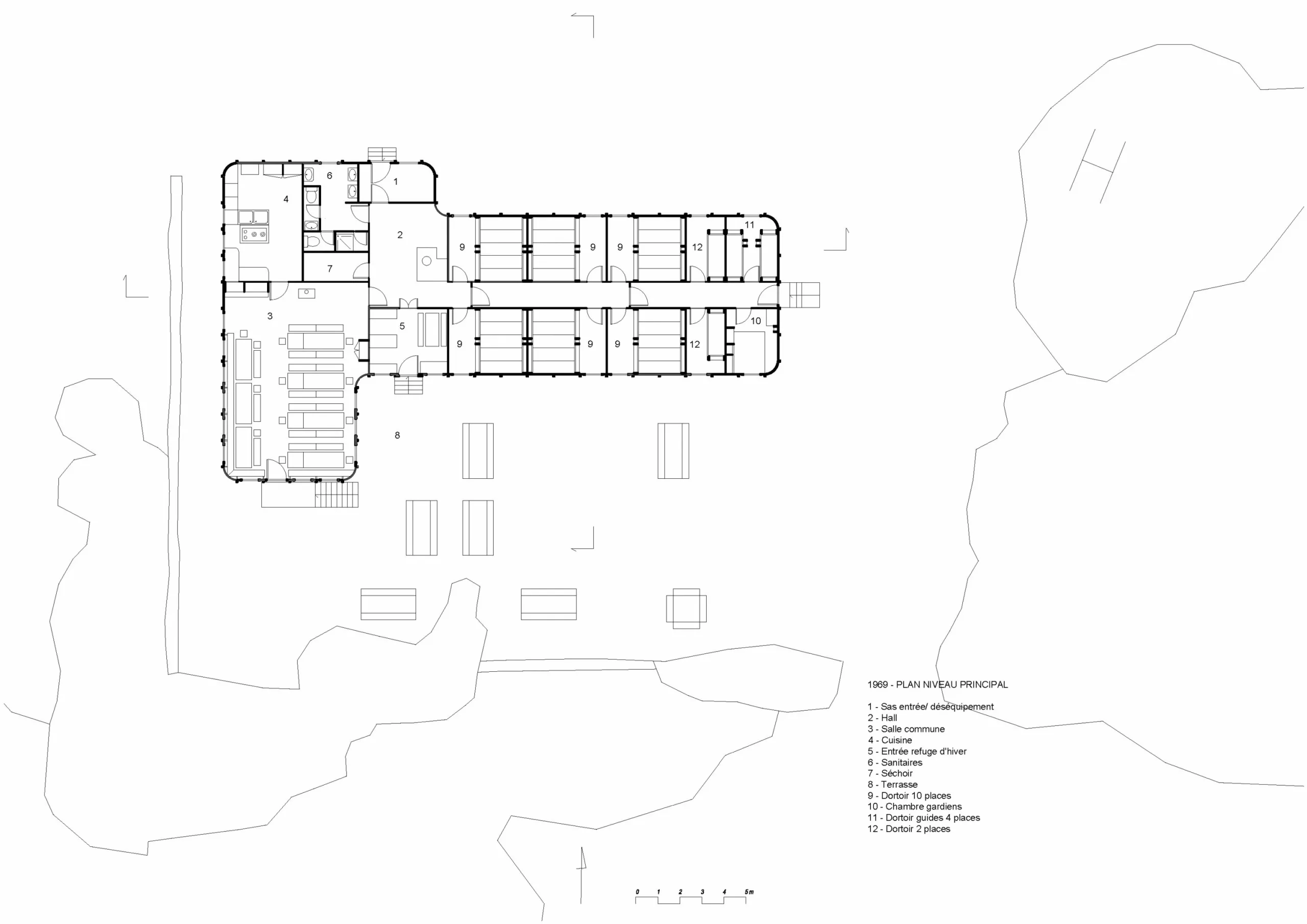 Accessible à tous les publics randonneurs, l’architecture du refuge des Évettes est représentative des expérimentations conduites au cours des années 60-70. Le refuge des Évettes est construit à 2594 m d’altitude en 1970 lors de la politique de renouvellement des équipements d’altitude engagée par le Club Alpin français (CAF). Son architecte, Guy Rey-Millet (1929-2017), de l’Atelier d’architecture en Montagne (AAM) de Chambéry, sollicite les conseils de Jean Prouvé. Le constructeur de génie lui recommande l’emploi d’un procédé qu’il a mis au point avec l’ingénieur Léon Pétroff (1925-2016) : des caissons en barres triangulées assemblés formant une résille tridimensionnelle permettant de couvrir une surface dégagée de tout point porteur, fermée par des panneaux Matra 2 en plaques de fibrociment protégées par une résine et une peinture gel coat. L’emploi d’éléments techniques préparés en atelier garantissaient économie et simplicité dans leur mise en œuvre au cours du chantier et une conception du refuge caractérisée par une sobriété des espaces et une gestion simplifiée. Ce qui a permis jusque-là un usage polyvalent, reposant sur une forme de rusticité contemporaine.