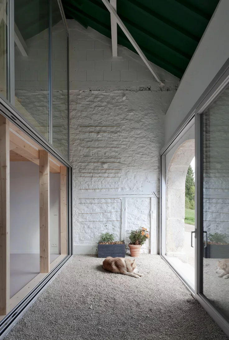 Face à ce paysage exceptionnel, un jardin d’hiver est ménagé entre l’espace d’habitation et le paysage. Un grand mur-rideau est érigé contre une ossature bois rapportée, les fenêtres sont judicieusement placées sur la toiture, tandis que la porte de grange est remplacée par un grand châssis fixe posé en applique intérieure. Depuis la rue, ses montants s’effacent et laissent la place au reflet du lac sur la grande plaque de verre. De l’intérieur, c’est un tableau qui coulisse au gré des saisons.