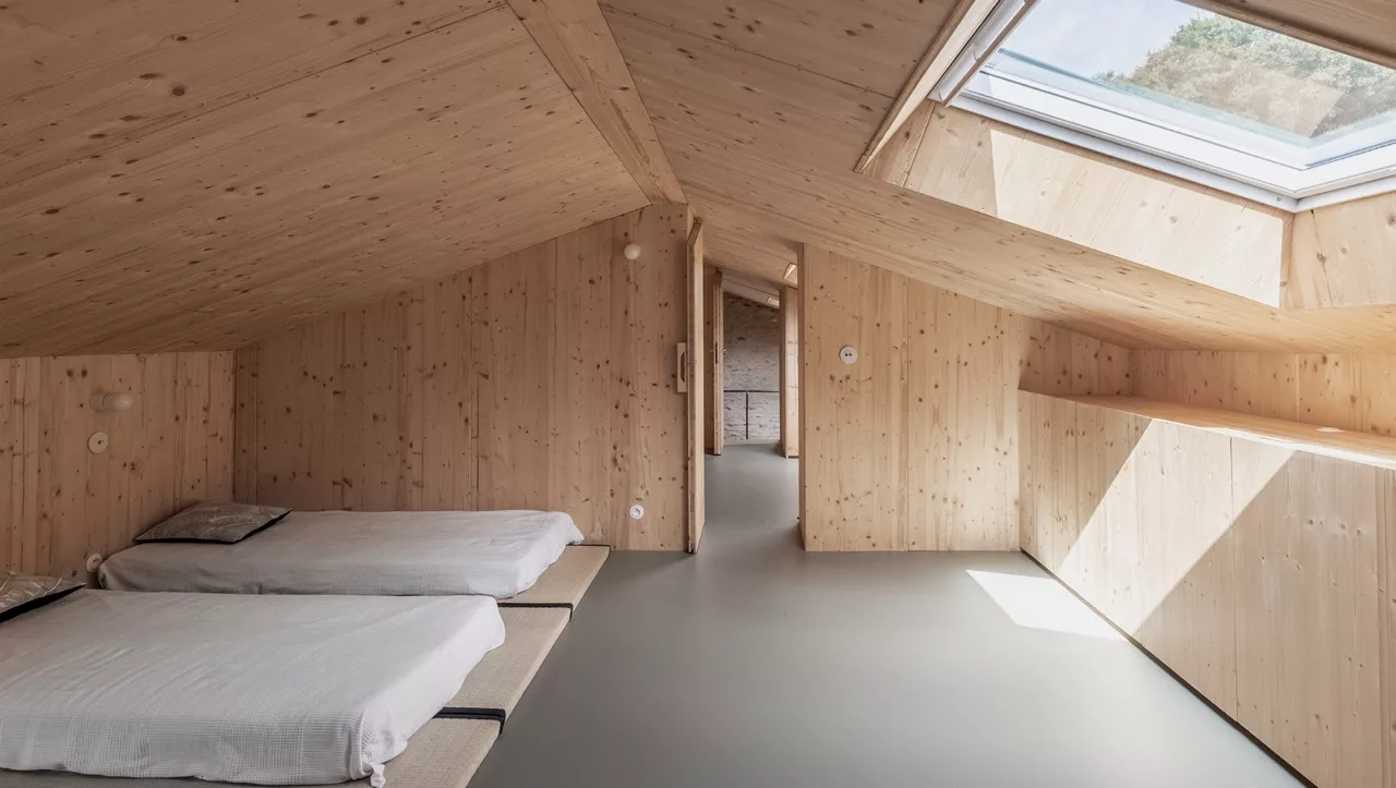 Le projet est entièrement construit en ossature bois. Les matériaux utilisés sont bio-sourcés. L’isolation thermique – très performante – est en laine de bois. Les revêtements des sols, murs et plafonds, sont en épicéa brut non raboté issu des forêts de la région. Ils créent une ambiance chaleureuse et naturelle.