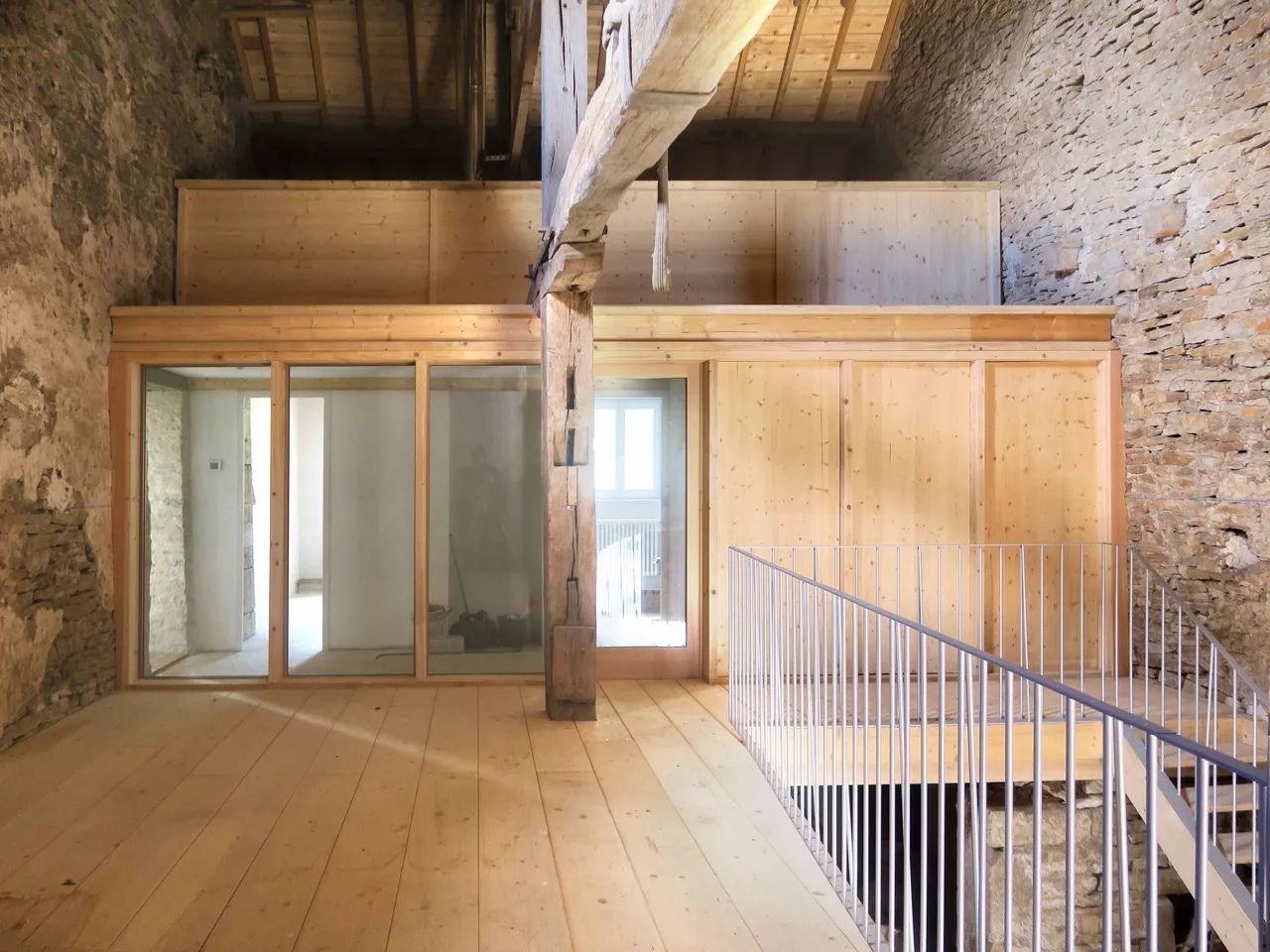 Le projet transforme la partie grange en logement qui occupe les deux tiers est du bâtiment. Cette ancienne grange est aveugle et semi-enterrée dans la déclivité du terrain. Le programme prévoit un studio indépendant pour des invités, une grande pièce chambre-bureau et un sauna.