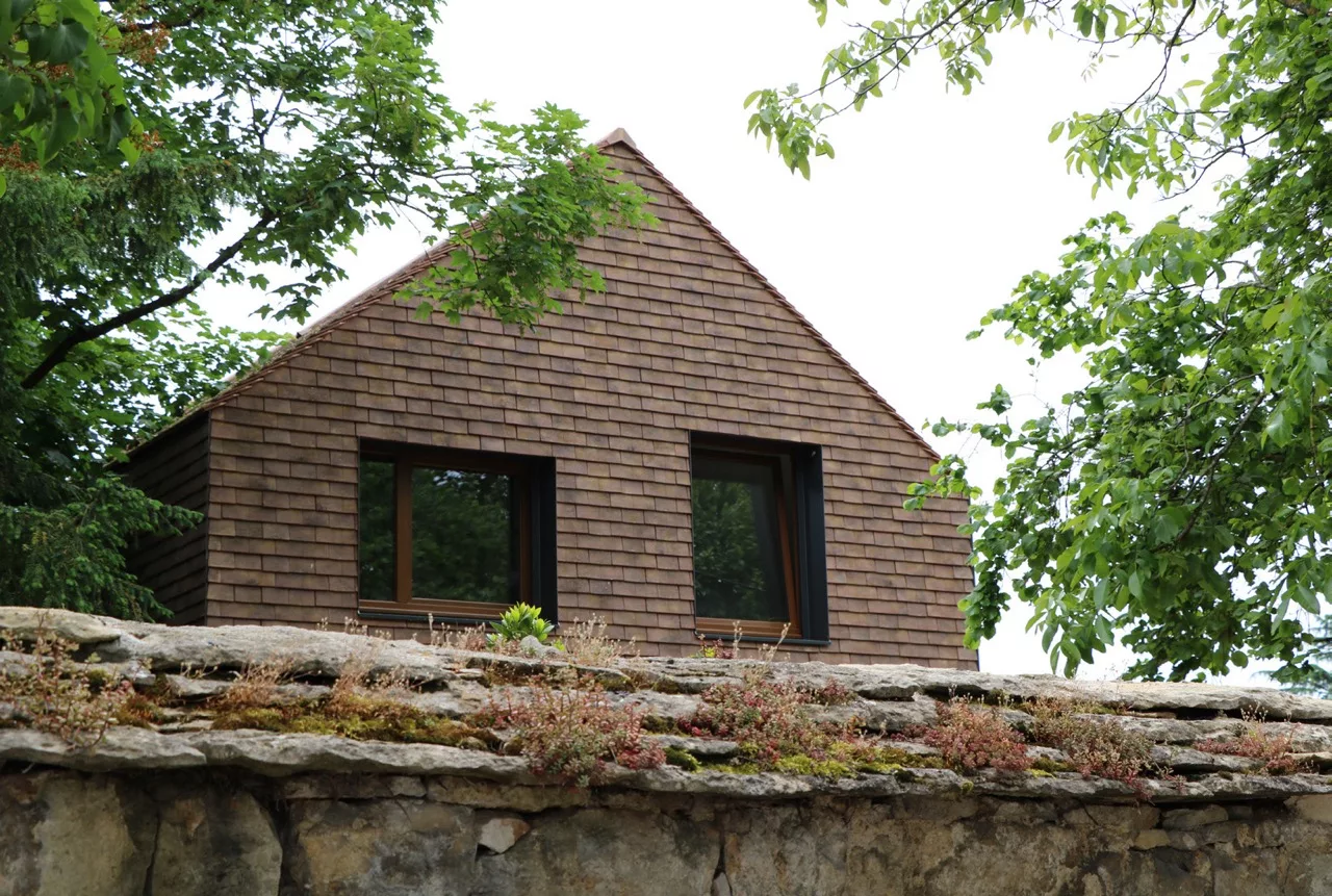 Le projet s’intègre dans son environnement en réinterprétant l’architecture traditionnelle locale. La maison est un simple volume couvert d’une toiture à deux pans sans débords ni gouttières, reprenant le modèle de la maison bourguignonne. L’utilisation de tuiles (tuiles de terre cuite plates de teinte chevreuse nuancée) en façades et en toiture fait écho au patrimoine de la région, rappelant aussi bien les tuiles vernissées des édifices prestigieux que les simples tuiles de terre cuite plates des constructions vernaculaires. En plus d’assurer une unité de matérialité et une lecture claire de la volumétrie du projet, ces tuiles servent de protection aux parois.