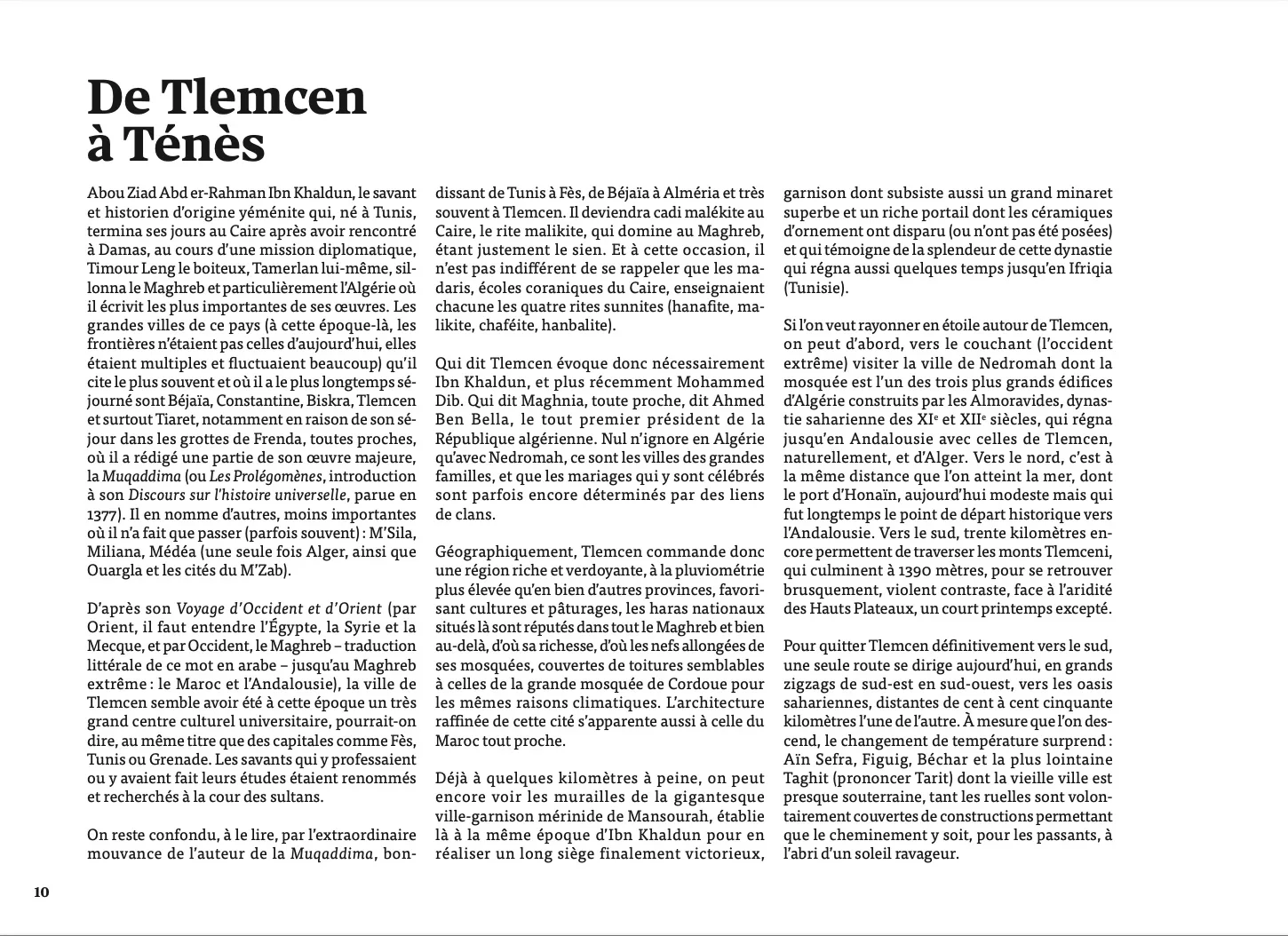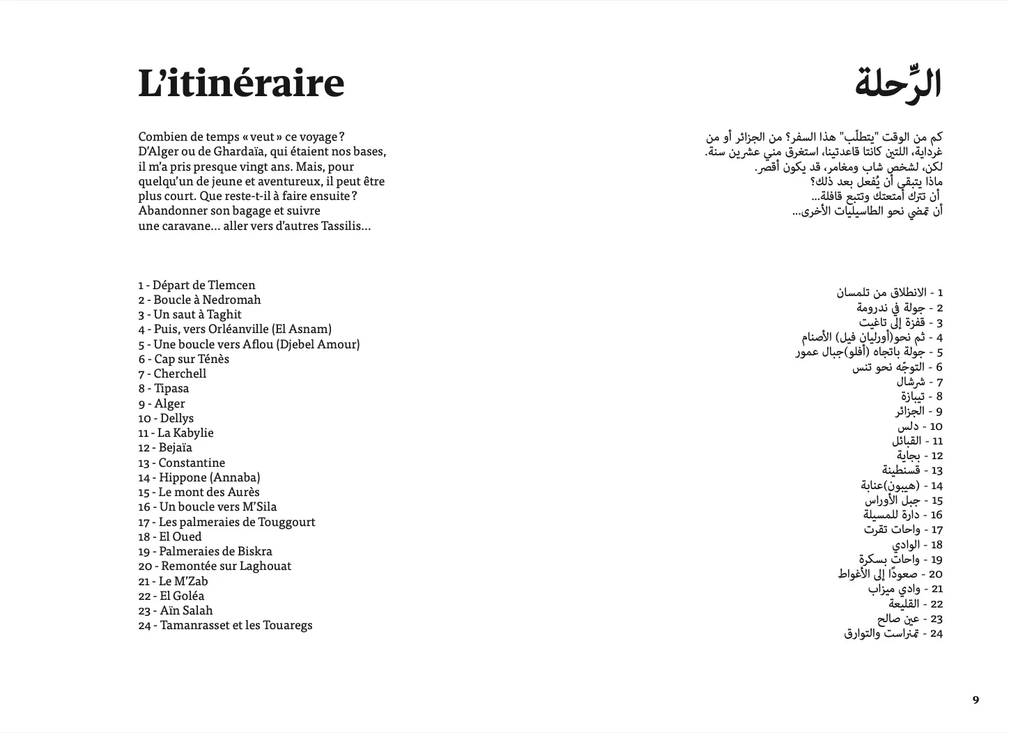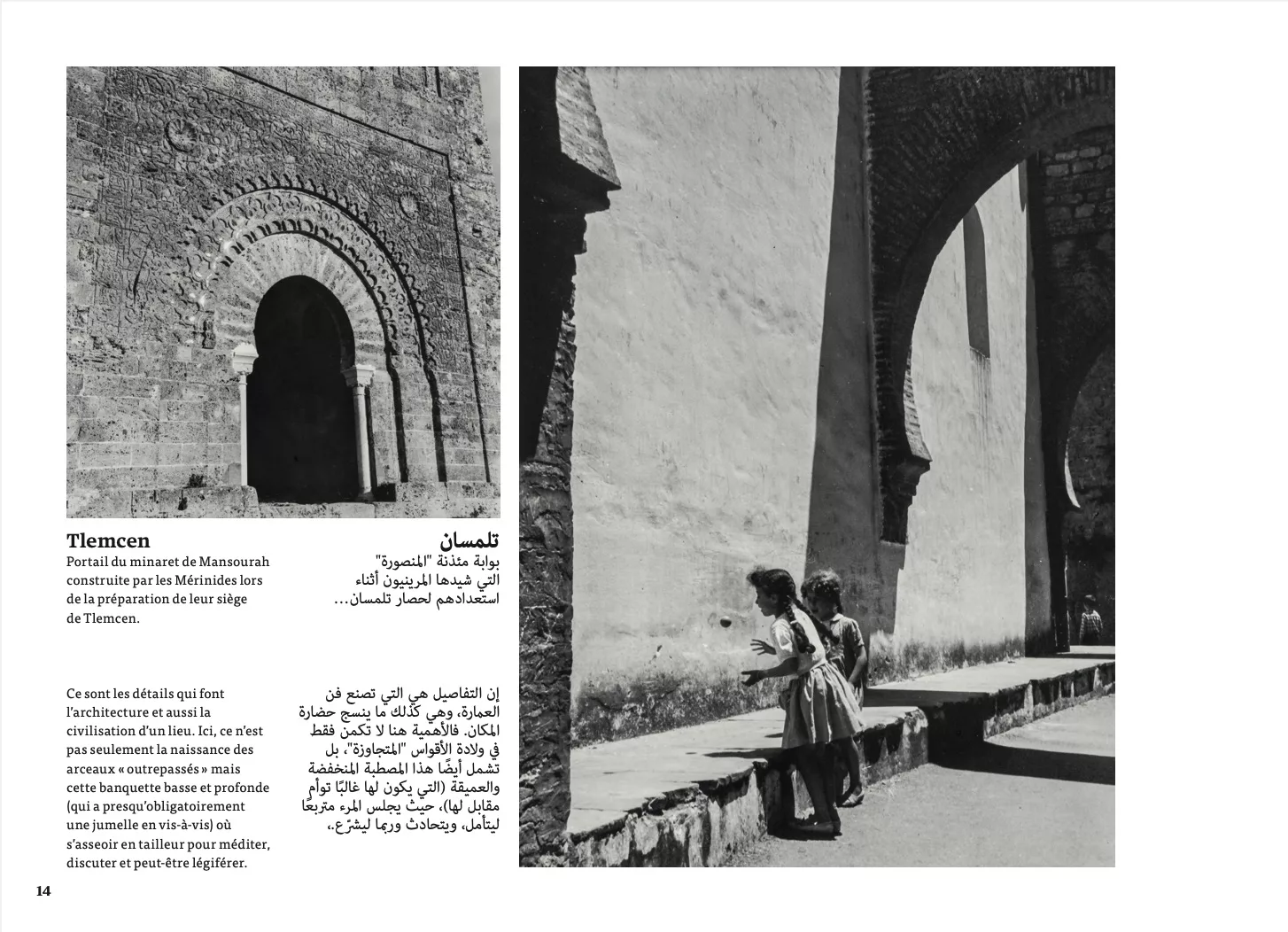 Avec humanité et érudition, Manuelle Roche nous transmet son amour de l’Algérie, de ses paysages, de son architecture et de ses habitants, au gré de pérégrinations qui l’ont menée de la côte méditerranéenne jusqu’au plus profond du Sahara. Création littéraire et photographique, cet ouvrage est aussi, en quelque sorte, une œuvre testamentaire, l’auteure étant décédée peu de temps après l’avoir terminé. Conservée en l’état, sans transformation dans le choix et l’ordre des photographies ni modification des textes et des légendes, la maquette du livre est enrichie d’une traduction en arabe des textes français.